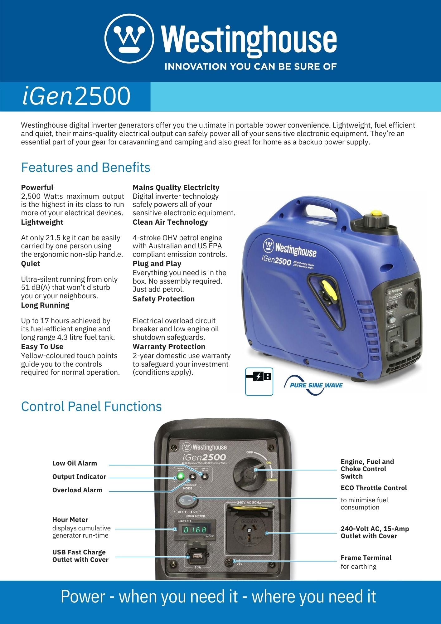 - 98 cc Westinghouse 4-Stroke OHV Petrol Engine.