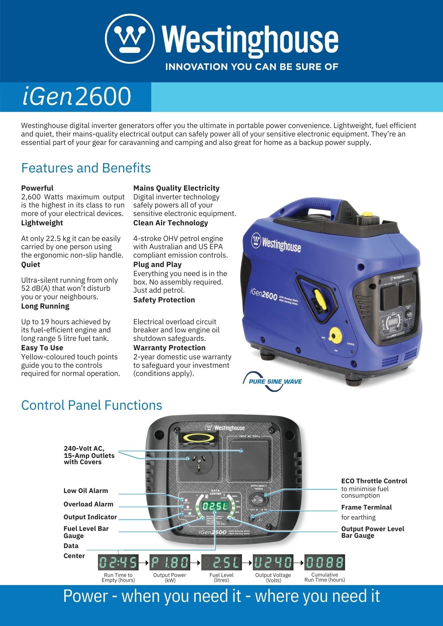 - Up to 19 Hours Run Time with 5 Litre Fuel Tank