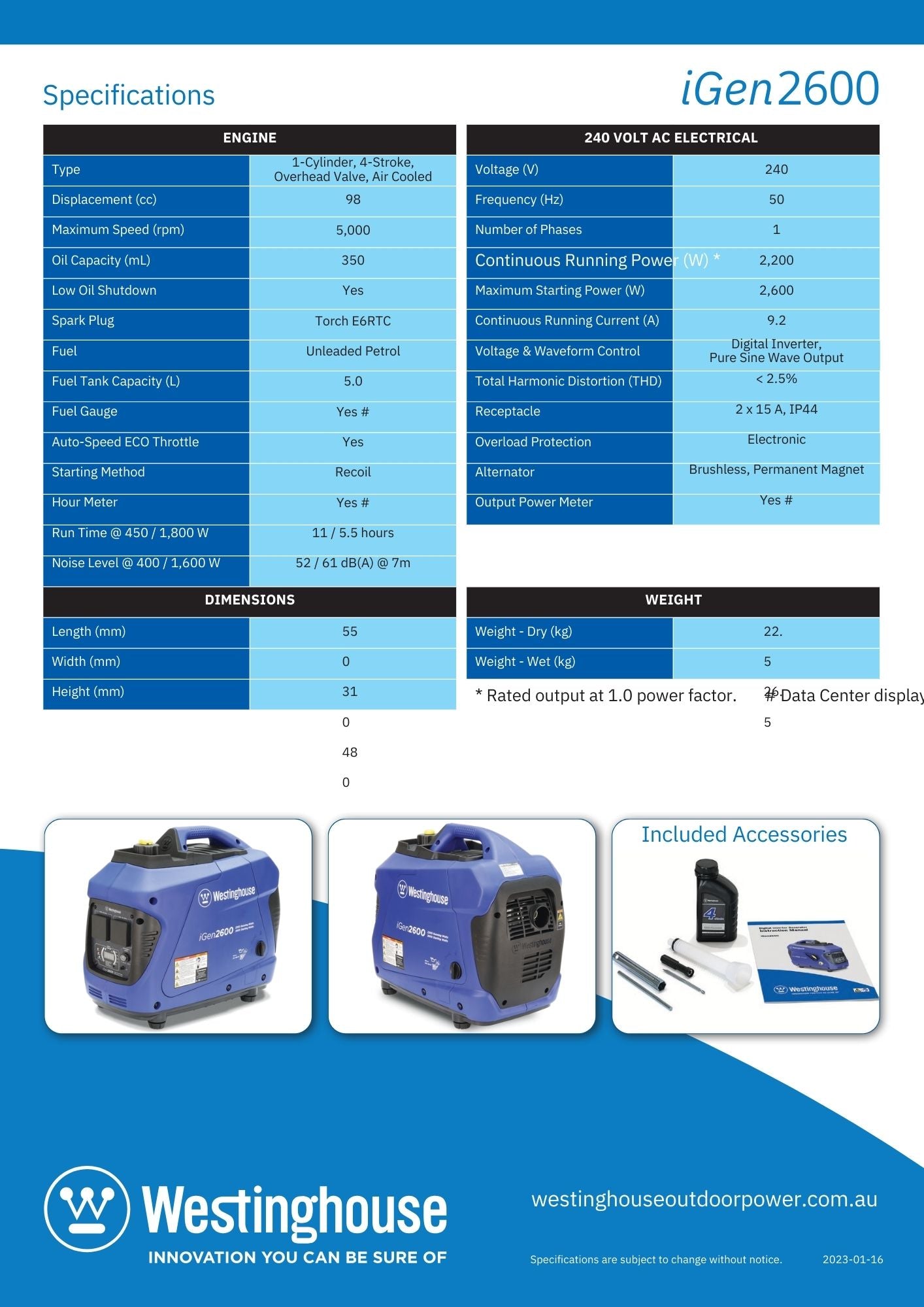 - 98 cc Westinghouse 4-Stroke OHV Petrol Engine.