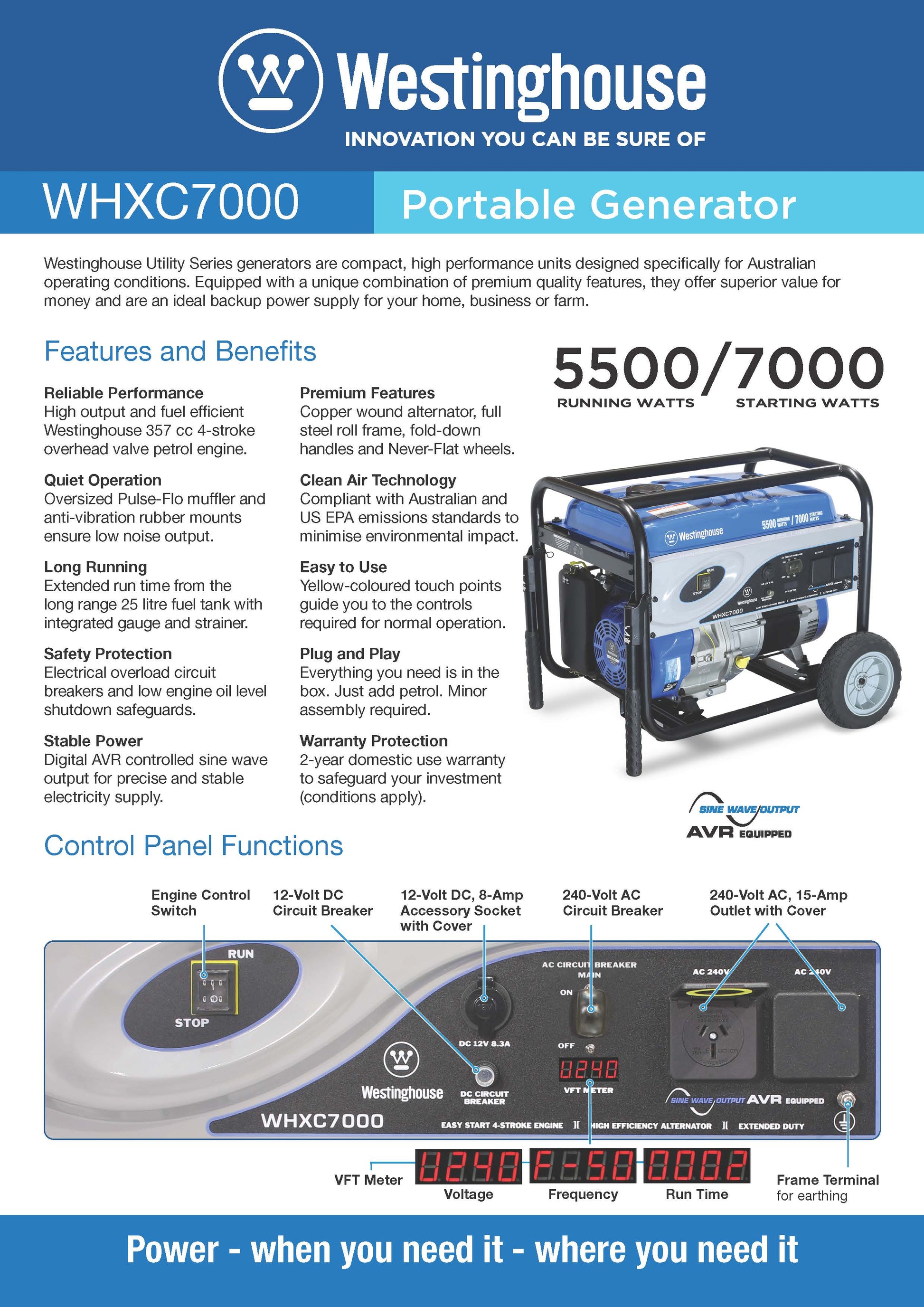 - 420 cc Westinghouse 4-Stroke OHV Petrol Engine.